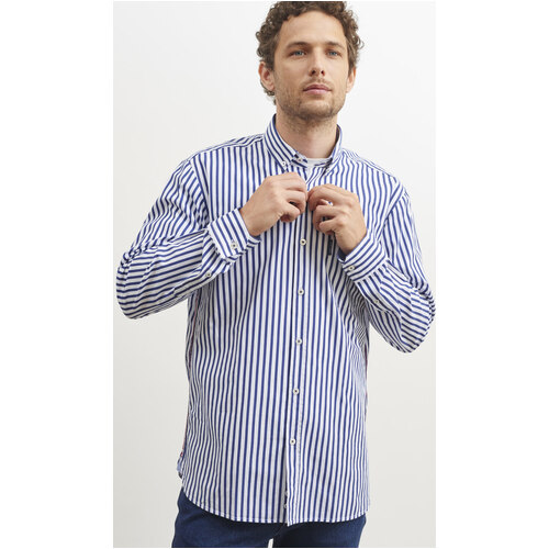 Long sleeve shirt in striped poplin. Contrasting Oxford fabric on inner base of collar and cuffs. Angled cuffs and pockets. Button-down collar. Length: 78cm Regular fit.